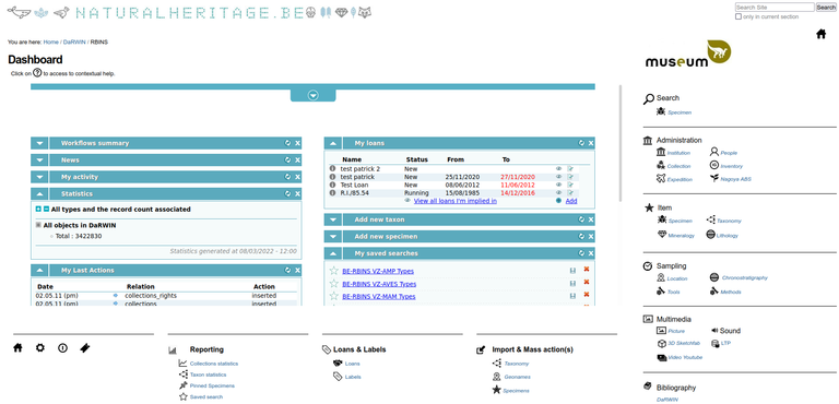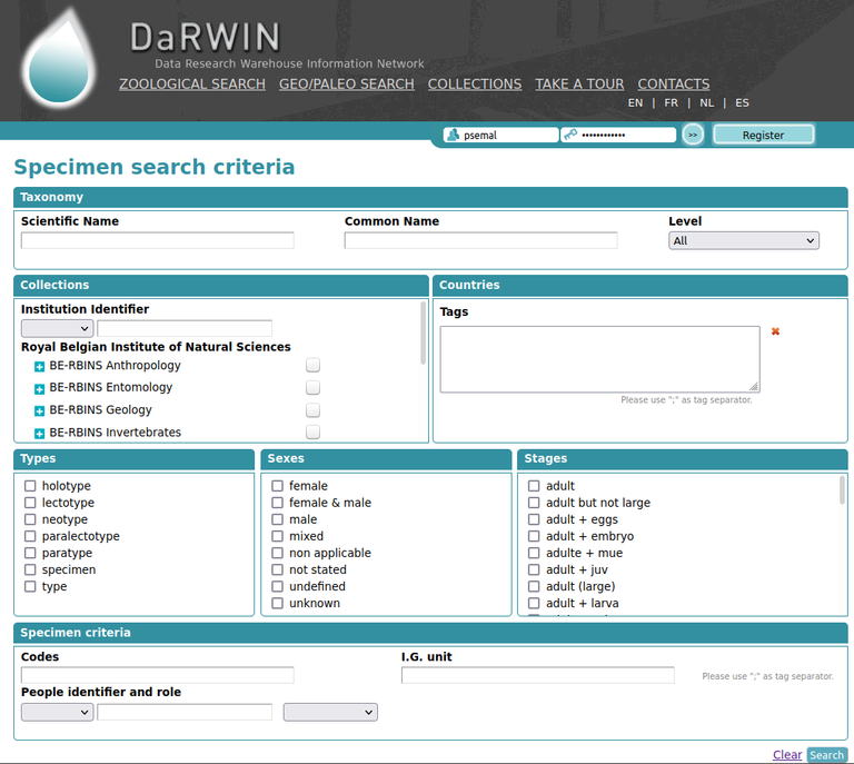 2. The embedded interface with your website or in the naturalheritage.be portal with 2 clicks menu and integrated help (?): https://www.naturalheritage.be/darwin/rbins Security: https for all connections. User/Password at the DaRWIN level, possibility to add User/Password at the web interface level and User/Password at the VPN if Intranet is activated.